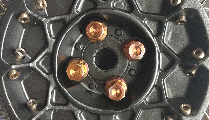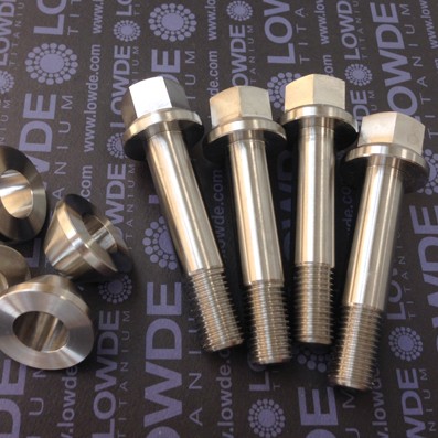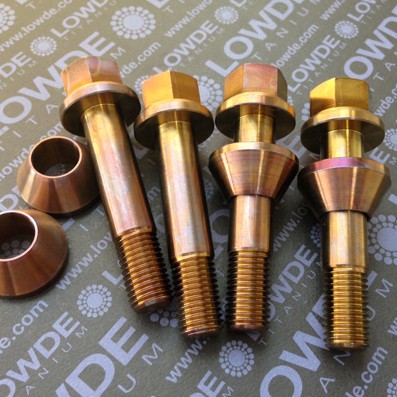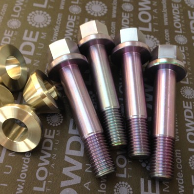 4 Tornillos M12x60 mm. longitud rosca de 20 mm. y 4 casquillos rueda trasera BMW R850/1100GS de Ti gr. 5 (6Al-4V). Anodizamos sin coste adicional.