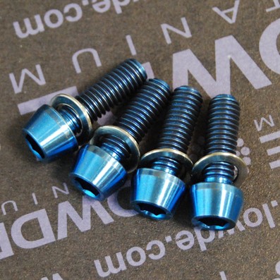 Kit 4 tornillos CÓNICOS M5x15 titanio gr. 5 (6Al-4V) Anodizados color azul intenso Llave allen de 4 mm. Diámetro cabeza: 8,5 mm. Altura cabeza: 5 mm.