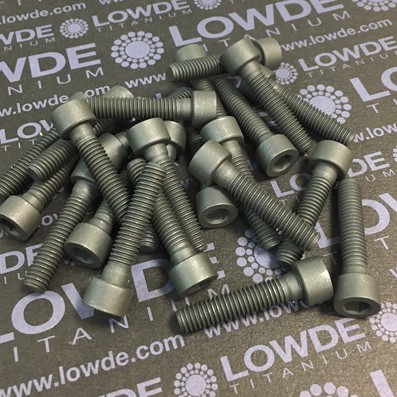 Lote de 23 tornillos DIN 912 (ISO4762) M6x1,00x28 mm. Titanio grado 5 (6Al4V) AMS 4928. Recubiertos de grasa sólida basada en busulfuro de molibdeno (MoS2). El recubrimiento tiene nombre comerical "EVERLISK 1301". Controles de tolerancias en todas sus cotas. Se suministra con certificado DIN 10204 3.1 (trazabilidad, propiedades mecánicas, composición química, etc.) y ficha completa del recubrimiento.