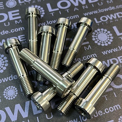 Cheese socket head screw DIN 65517-08022A (Mj8x1,00x35 mm.) Titanio grado 5 (6Al-4V) AMS 4965M (1100 MPa). Cabeza forjada, mecanizado, fondo huella estampada, y rosca laminada, según norma. Controles de tolerancias en todas sus cotas. Certificado UNE EN10204. Lot.: LWD/530-23801077