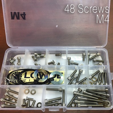 El kit de 48 tornillos M4 es la medida menos habitual en bicicletas. Algunas potencia de manillar, sujección manetas, accesorios Garmin. La caja contiene además de los 48 tornillos arandelas y dos colgantes LOWDE.