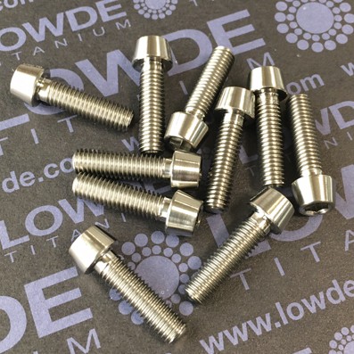 1 Tornillo FORJADO* DIN 912 tapered M5x18 mm. de Ttanio gr. 5 (6Al4V). Diámetro base de la cabeza: 8 mm. Diámetro parte superior de la cabeza: 6,4 mm. Altura cabeza: 5 mm. Para llave allen de 4 mm. La base de la cabeza de Ø8 mm. se ajusta habitualmente en potencias de manillas de bicicleta.