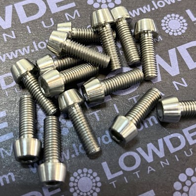 1 Tornillo DIN 912 CÓNICO M5x0,80x15 mm. de Titanio gr. 5 (6Al4V). Diámetro base de la cabeza: 8,4 mm. Diámetro parte superior de la cabeza: 6,4 mm. Altura cabeza: 5 mm. Para llave allen de 4 mm. Lot.: LWD/534/903-2304652