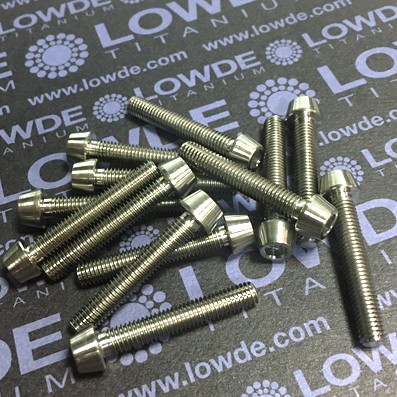 1 Tornillo DIN 912 (cónico) M5x0,80x30 mm. de titanio gr. 5 (6Al4V). Diámetro base de la cabeza: 8 mm. Diámetro parte superior de la cabeza: 6,4 mm. Altura cabeza: 5 mm. Para llave allen de 4 mm. Longitud de rosca: 25 mm. Certificado: LOWDE/2103/521/A