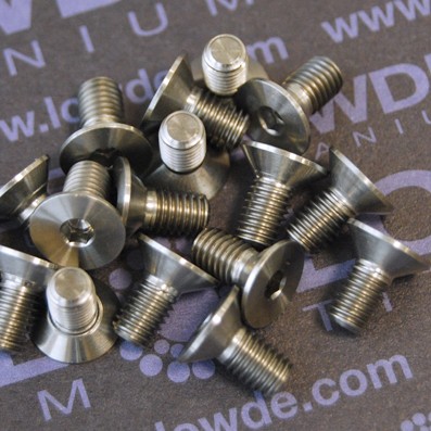 1 Tornillo avellanado DIN 7991 M5x0,80x10 mm. de Titanio gr. 5 (6Al4V) Cabeza para llave allen. El tornillo mide 10 mm. de longitud incluida la cabeza. Lot.: LOWDE/L/2007/578/A