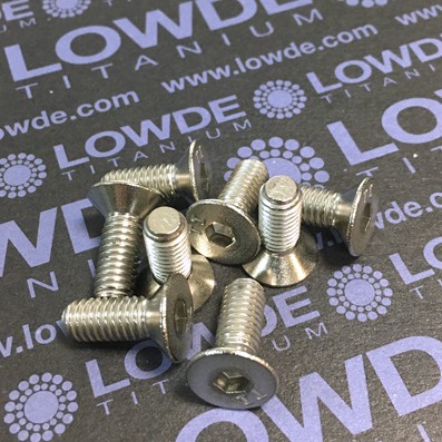 Avellanado DIN 7991 M6x16 mm. de titanio gr.2 . Cabeza para llave allen de 4 mm. El tornillo mide 16 mm. de longitud incluida la cabeza. Fabricado mediante estampación.