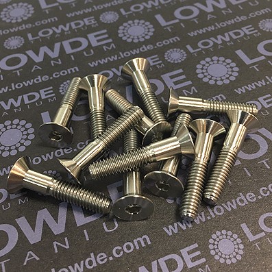 1 Tornillo avellanado DIN 7991 M6x30 mm. de titanio gr. 2. Cabeza para llave allen de 4 mm. El tornillo mide 30 mm. de longitud incluida la cabeza. La longitud roscada es de 20 mm. Mecanizado de redondo Ø 12 mm., rosca laminada. Cert.: LOWDE/2019011252