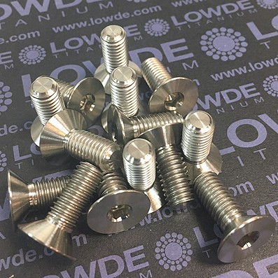1 Tornillo avellanado DIN 7991 M8x1,25x20 mm. de titanio gr. 5 (6Al-4V). Cabeza para llave allen de 5 mm. El tornillo mide 20 mm. de longitud incluida la cabeza. Enteramente mecanizado, rosca laminada. Fabricado a partir de varilla ASTM B348 Ø16 mm. Cert.: LOWDE/2103/522/A