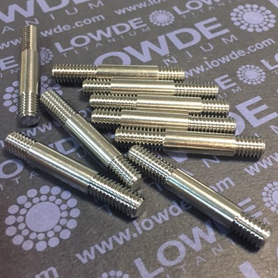 1 Espárrago DIN 938 M6x39 mm. de Titanio grado 5 (6Al-4V). Paso de rosca: 1,00 mm. -el habitual en métrica 6-. Longitud de rosca en un extremo de 8 mm. y en el otro de 12 mm. Pieza mecanizada a partir de varilla de Ø6 mm. con roscas laminadas. Límite elástico verificado: 857 MPa. Resistencia tracción verificada: 916 MPa. Certificado: LOWDE/L/1809/375/A