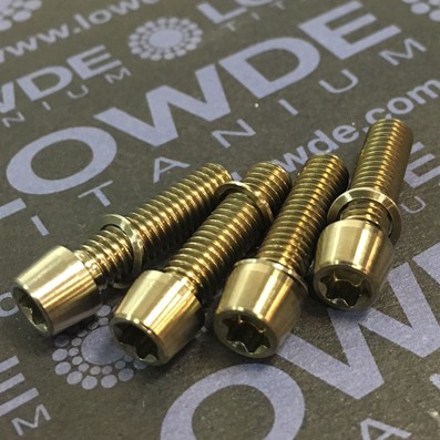 Kit 4 tornillos cónicos M5x18 llave torx de titanio gr. 5. DIÁMETRO CABEZA: 7 mm. Altura cabeza: 5 mm. Arandelas mismo diámetro que la cabeza incluidas. Anodizado en color marrón bronce claro.
